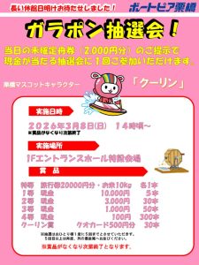 ご当選された方は当選番号の半券を持って期間までに1Fインフォメーションまでお越しください!