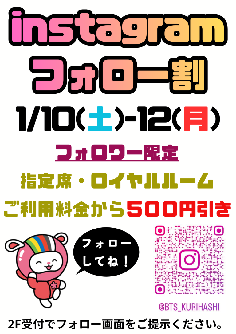 公式instagramフォロワー限定!有料席 フォロー割を実施!