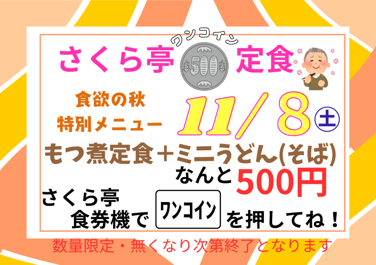 11/8㊏ さくら亭 ワンコイン定食をご提供!