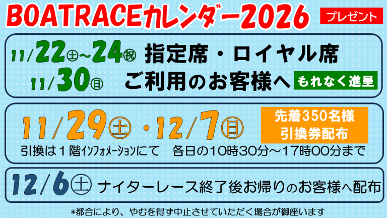 大好評の『BOATRACEカレンダー2026』を以下の日程でプレゼントいたします。