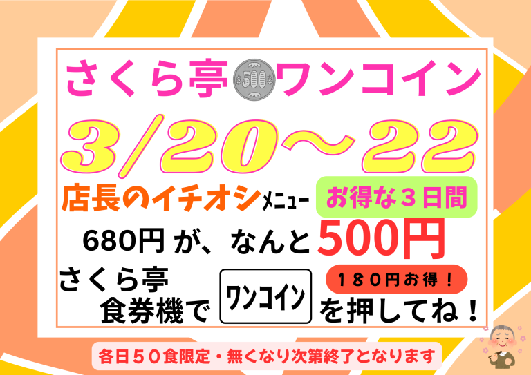 3/20㊎~3/22㊐ さくら亭ワンコイン企画!